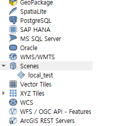 - qgis 탐색기에서 Scenes에 오른쪽 마우스클릭해서 3dtiles connection을 추가함.