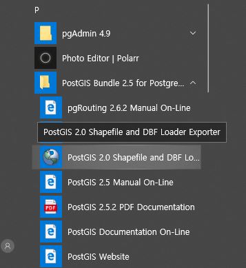 윈도우 메뉴에서 실행 - postgresql을 설치하고 shp파일을 db에 넣으려고 postGIS 2.0 Shapefile을 실행함